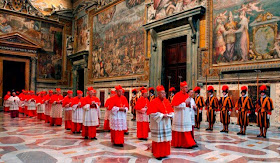 Los cardenales electores, los 115 que están en Roma y que tienen menos de 80 años, ingresan a la Capilla Sixtina rezando las letanías. Concluidas las letanías y una vez que cada uno ha ocupado su asiento cantarán el "Veni Creator Spiritus", himno en latín en el que invocan la presencia del Espíritu Santo.