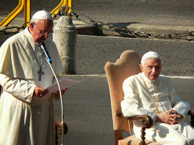 Inmediatamente llegó el Papa Francisco quien abrazó con afecto a Benedicto XVI y permanecieron juntos durante toda la ceremonia. Después de un breve saludo del Cardenal Giuseppe Bertello, Presidente del Gobernatorato, y de la intervención del Cardenal Presidente emérito, Giovanni Lajolo, quien ilustró el significado del nuevo monumento y de la fontana dedicada a San José, que fue inaugurada anteriormente, el Santo Padre dirigió unas palabras y sucesivamente rezó dos oraciones de consagración impartiendo, en fin, la bendición apostólica a toda la asamblea.